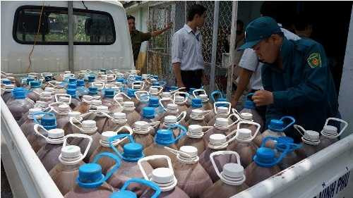 | Hàng chục can nhựa (loại 50 lít) đựng mắm bị lực lượng chức năng thu giữ đưa đi xét nghiệm |