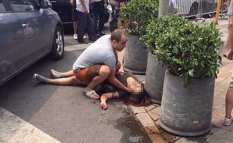 | Hình ảnh cho thấy một người đan ông nước ngoài đỡ cô gái sau khi bị đâm |