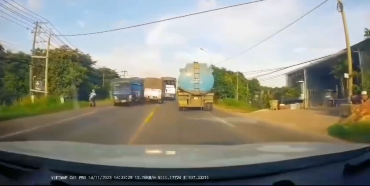 Tại đoạn đường nhỏ hẹp, tầm nhìn bị hạn chế nhưng tài xế xe tải vẫn nối đuôi nhau vượt ẩu, dẫn đến tai nạn với ô tô đi ngược chiều trên quốc lộ 20 (Đồng Nai).