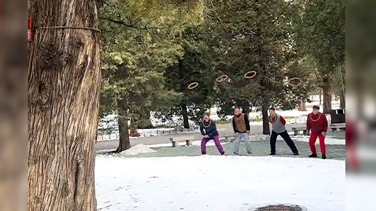 5 cụ ông tại Bắc Kinh, Trung Quốc tập thể dục bằng cách tung vòng tròn vào cổ khiến người xem kinh ngạc.