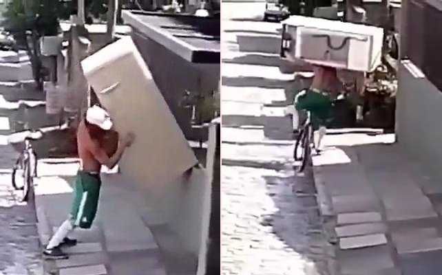 Kinh ngạc cảnh vác tủ lạnh lên vai, vận chuyển bằng xe đạp trên phố