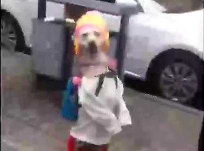 Kinh ngạc chú chó mặc váy, đi 2 chân như người
