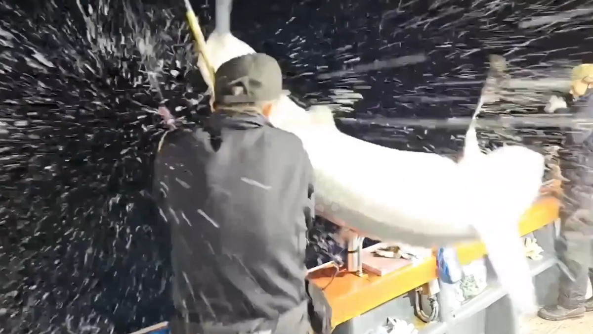 Người đàn ông ở Nam Gyeongsang, Hàn Quốc đang đứng câu cá trên tàu thì bất ngờ một con cá mập nhảy lên khỏi mặt nước lao thẳng vào cần thủ.