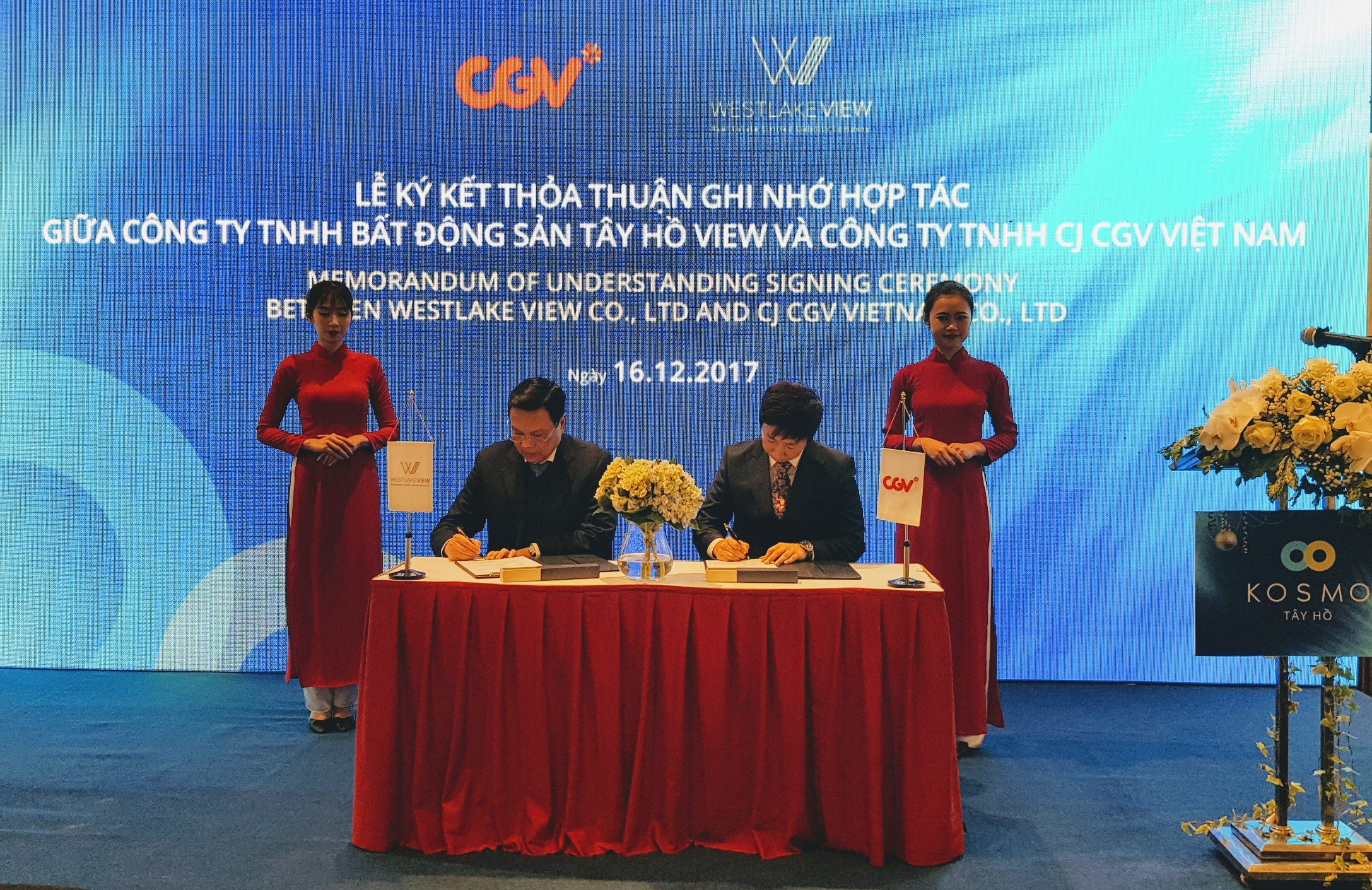 Tại lễ ký kết thỏa thuận hợp tác, ông Jaesoo Ko – Giám đốc tài chính của CGV Việt Nam nhận định “Dự án Kosmo Tây Hồ với đặc điểm nổi bật về vị trí đắc địa, thiết kế cao cấp, cùng hệ thống tiện ích: Trung tâm thương mại, trường mầm non quốc tế, nhà hàng danh tiếng, bể bơi nước ấm, phòng tập Gym… xứng đáng là một điểm sống lý tưởng với chất lượng sống cao nhất cho các gia đình hiện đại tại khu vực Tây Hồ, thành phố Hà Nội. Chính vì vậy, từ 3 năm trước CGV Việt Nam đã thương thảo, xây dựng mối quan hệ bền chặt, trao đổi kinh doanh với công ty Tây Hồ View để có được thỏa thuận đặc biệt này”.