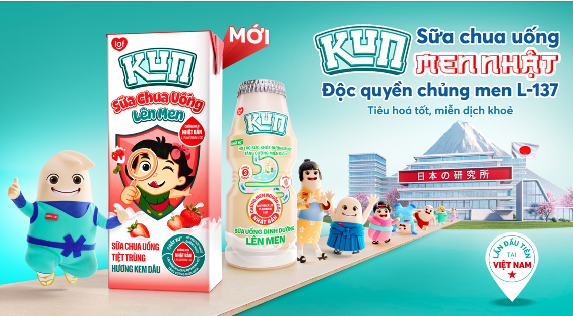 Đáng chú ý, lần đầu tiên tại Việt Nam, các mẹ có thể dễ dàng tìm thấy chủng men L-137 độc quyền trong sữa chua uống KUN Men Nhật cho bé.