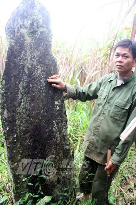 | Anh Trường bên cột đá quây mộ duy nhất còn sót lại. Cột đá có chữ Nho nhưng không đọc được vì đã mờ |