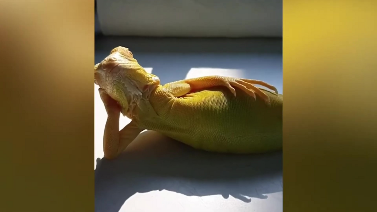 Được đem ra sưởi nắng, chú kỳ đà nằm dài ra, tạo dáng y như người mẫu bikini trên biển, mặc kệ người chủ vừa cười vừa quay phim.