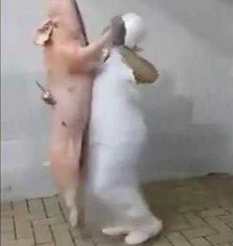 Kỳ dị người đàn ông khiêu vũ với xác lợn trong lò mổ