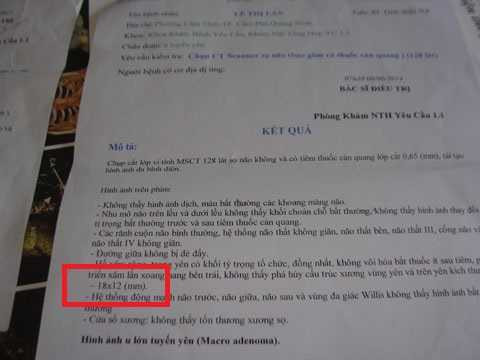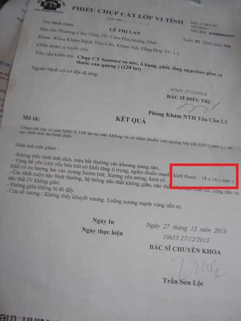 Thấy mẹ đau, ông Phạm Ngọc Lộc đưa cụ Lan đi khám ở bệnh viện trên Hà Nội thì phát hiện cụ Lan bị u tuyến yên kích thước 18mmx16mm. Về Quảng Ninh, cụ được chụp cắt lớp lại, kết quả cũng như vậy.