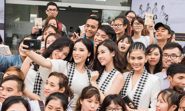 Hoa hậu Đỗ Mỹ Linh, Á hậu Thanh Tú và Á hậu Trương Thị May bị sinh viên vây kín và xin chụp ảnh cùng.