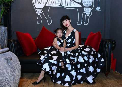 | Hai mẹ con Xuân Lan rất đáng yêu khi cùng diện thiết kế kiểu cổ điển bằng chất liệu taffta. Trang phục này thuộc bộ sưu tập 'Love' của nhà thiết kế Đỗ Mạnh Cường. Siêu mẫu làm tiệc mừng tuổi mới sớm 3 ngày cho bé Thỏ. |