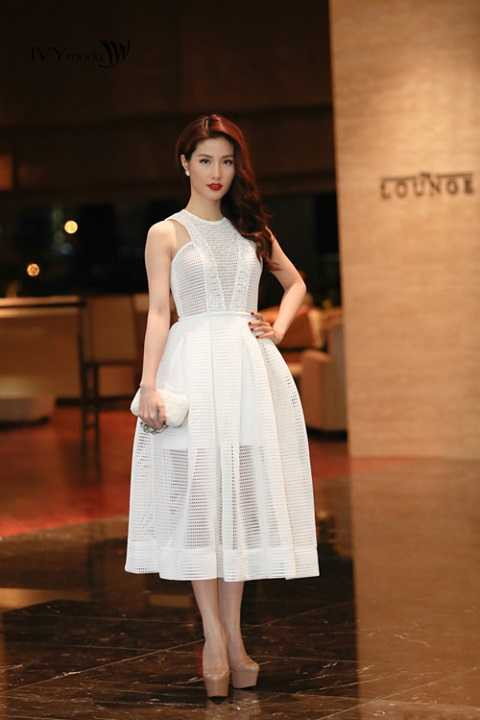 | Diễm My 9x xinh như nàng công chúa với đầm trắng xuyên thấu xếp pli xòe. |