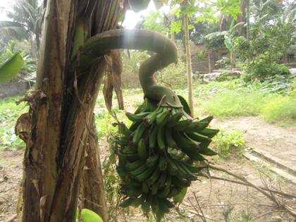 | Cuống buồng chuối lạ cong và ngoằn nghèo so với những buồng chuối khác |
