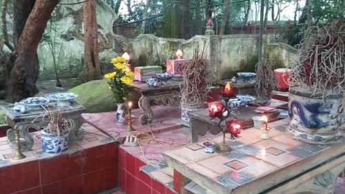 | Trên bàn thờ có đầy đủ lư hương, đèn, hoa để người dân tới dâng lễ. |