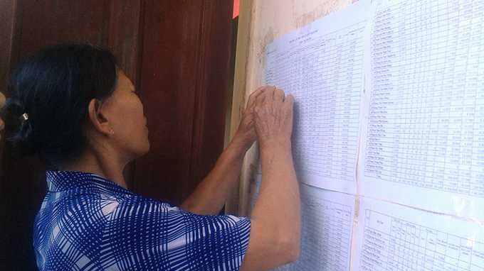 | Một phụ nữ ở xóm Trà Dương, xã Quang Lộc, huyện Can Lộc (Hà Tĩnh) rà danh sách xem gia đình chị phải đóng phí bao nhiêu - Ảnh: V.Định |