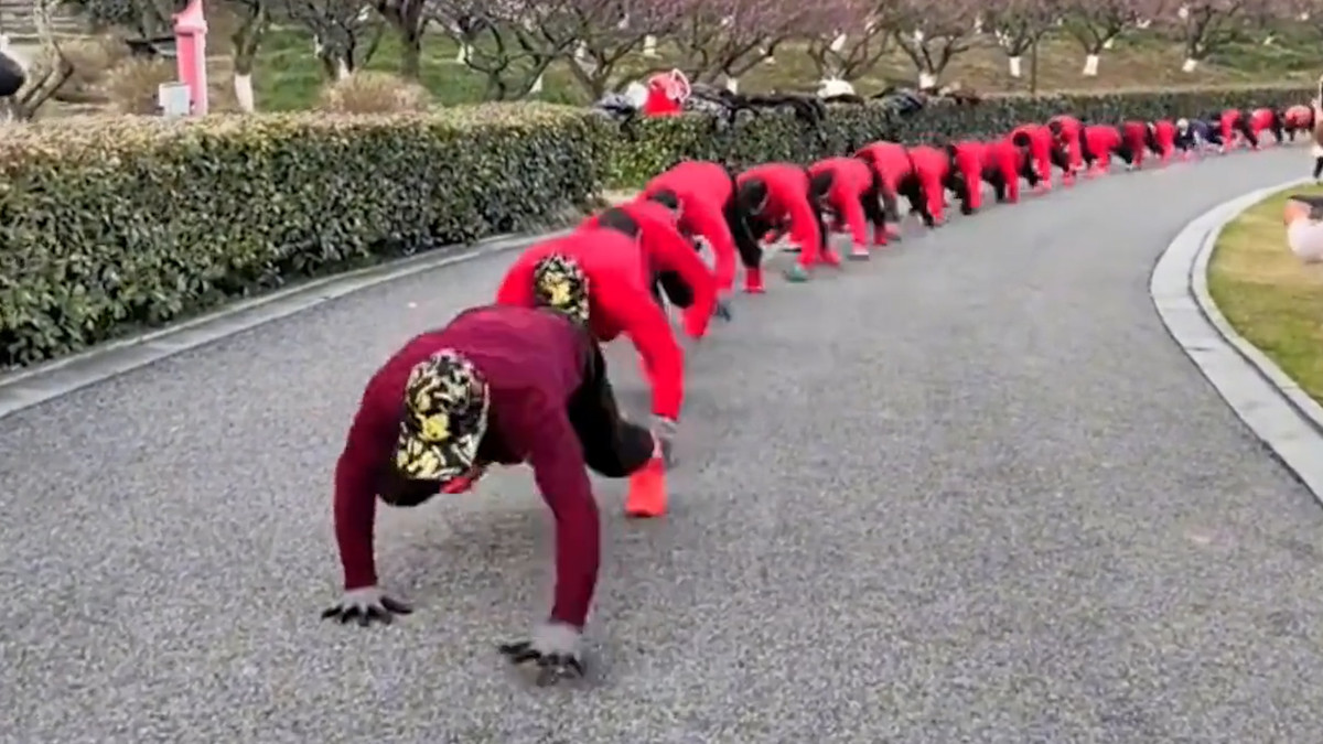 Kỳ lạ đoàn người tập thể dục như cá sấu bò