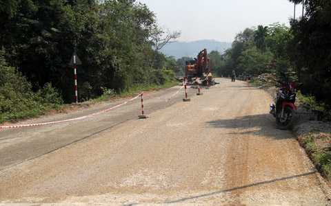 | Đoạn trên đỉnh dốc Đồng Bụt bị nứt, sụt lún, nhà thầu phải dùng máy múc xới lên làm lại. |