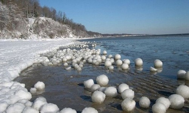 Năm 2017, cô Yuryi Shahov đi dạo tại khu vực vịnh Phần Lan, phía Tây Bắc nước Nga tình cờ ghi lại cảnh tượng hàng ngàn quả bóng tuyết trôi lập lờ trên mặt nước. Những quả bóng tuyết này kích thước khá giống nhau và có màu trắng đục.