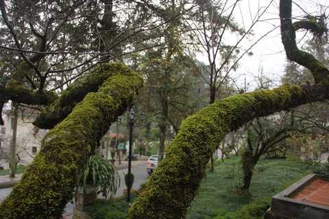 Để ý thì thấy đang nở hoa không phải cây trẻ, mà là những cây già nhất. Thời gian đọng thành rêu mốc trên thân cành.
