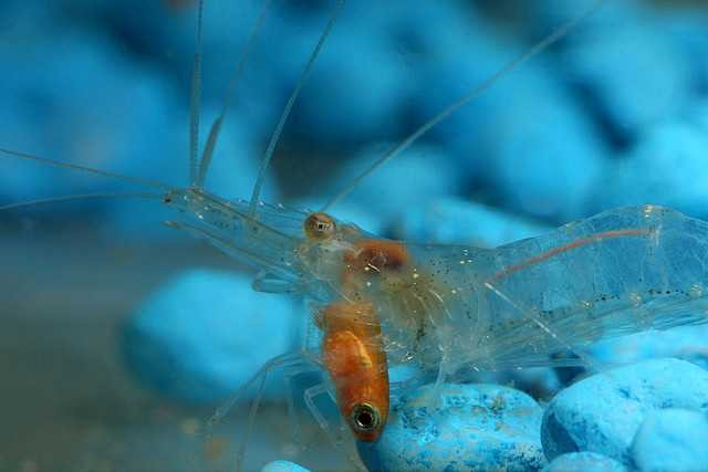 Trong khi những con tôm trưởng thành hiển thị thêm màu da cam hoặc màu đỏ trên râu, chân, và đuôi. Chúng có đôi mắt màu xanh nhạt. Con cái lộ rõ buồng trứng màu trắng ở khoang bụng.