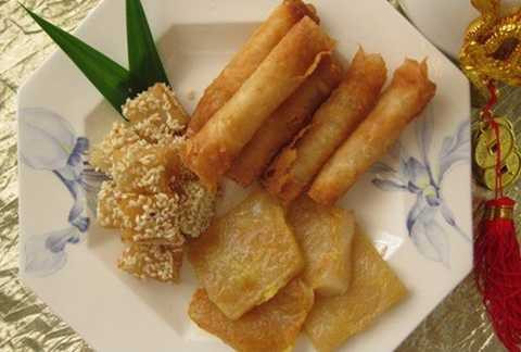 | Singapore và Malaysia: Món ăn truyền thống nổi tiếng của Singapore và Malaysia trong ngày tết là Yu Sheng. Đó là một loại gỏi với cá hồi sống và nhiều loại rau củ thái sợi như đu đủ, khoai môn, bưởi, gừng chua… Trước khi ăn món này, người ta sẽ đặt một số bao lì xì ở bên cạnh để tung tất cả lên không trung sao cho càng cao càng tốt, vừa có nghĩa là trộn đều, vừa có nghĩa là thịnh vượng. |
