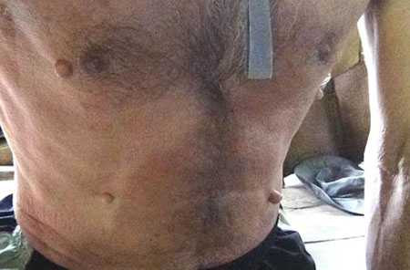 Khi ông Xoan cởi áo ra, chúng tôi quan sát thì thấy, ngoài 2 chiếc vú như người bình thường ở ngực; ở phần bụng ông Xoan có 4 khối thịt dư nhô ra, mọc song song và cách nhau rất đều 2 bên hông, có núm hồng trông cũng giống như những chiếc vú. Thảo nào, bà con Ca Dong ở nóc này, họ so sánh những chiếc vú ông Xoan giống như vú của con lợn lòi nấp trong rừng núi mà họ săn được…