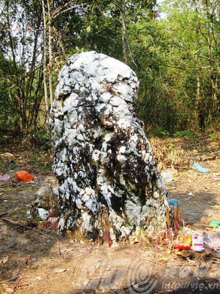 Tảng đá trắng nằm trên đỉnh đồi. Phía dưới, có một lối đi nhỏ cách đồi chừng 100m. Xưa, cây cỏ rậm rạp, không phải ai cũng dám lên để nhìn thấy khối đá, nhưng mọi người đều dừng lại dưới lối đi, đốt một nhúm thuốc lào để cúng.