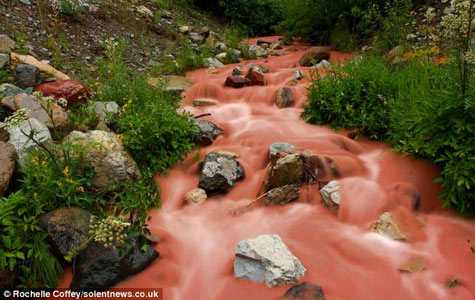 Một dòng nước đỏ như nước sốt cà chua tràn qua các lớp đá.