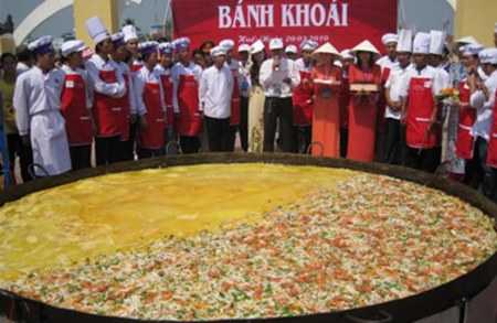 (VTC News) Vừa qua, tại thành phố Huế (Thừa Thiên Huế), Câu lạc bộ Bếp Lửa Cố đô Huế đã tổ chức đổ thành công chiếc bánh khoái lớn nhất Việt Nam với đường kính 3m, chu vi 9,42m, diện tích 7,06m2 và lớn gấp 396 lần so với chiếc bánh khoái truyền thống. Hình ảnh độc đáo do độc giả Nguyễn Loan gửi về.