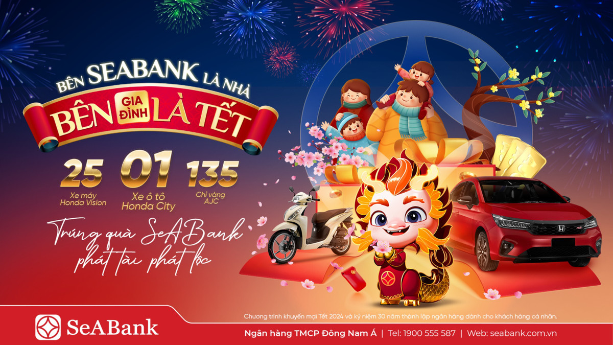 Với mong muốn mang đến nhiều may mắn và tài lộc cho khách hàng cá nhân dịp đầu xuân năm mới, từ nay đến hết 5/5/2024, SeABank triển khai chương trình khuyến mại Tết 2024 và kỷ niệm 30 năm thành lập ngân hàng với thông điệp “Bên SeABank là nhà - Bên gia đình là Tết” dành cho khách hàng sử dụng sản phẩm dịch vụ của SeABank với nhiều quà tặng giá trị lên tới hơn 2,3 tỷ đồng.