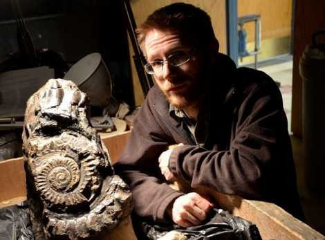 | Nhà địa chất học Leif Tapanila bên cạnh hóa thạch hàm răng của Helicoprion |