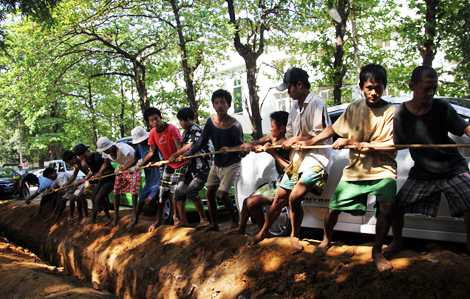 Cố đô Yangon 12 giờ trưa, nắng dựng đỉnh đầu, dưới vòng lá của những tán cây cổ thụ ven đường, hàng chục thanh niên và những đứa trẻ, hô réo cả lên. Những tiếng hô đồng thanh để lấy nhịp, kéo những sợi dây cáp ngầm. Trong số này có chú nhóc Yankin 14 tuổi.