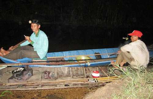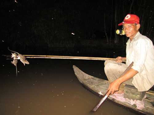 Gác máy lên xuồng, anh Sửu vội lấy chiếc đèn đội lên đầu, rồi đi thẳng đến mũi xuồng, còn tôi đi ngược lại phía sau để xem cách anh săn chuột. Anh Sửu ngồi lên chiếc ghế “chuyên dụng” để dễ quan sát, cạnh bên là ba cây chĩa (cán bằng trúc, mũi bằng thép) đã chuẩn bị sẵn được đặt dọc theo xuồng, tay anh vớt chiếc dầm lướt nhẹ trên mặt nước mà không hề phát ra tiếng động gì.