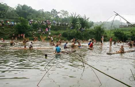 Mẻ lưới đầu tiên kéo lên cũng là lúc đồng loạt nhân dân quăng chài, thả vó. Cảnh tượng nhộn nhịp người quăng kẻ kéo, rồi có cả những người phi thân lao xuống suối kiểm tra vó, kiểm tra lưới. Có những người lặn cả vài phút dưới độ sâu hơn chục mét luồn lách vào tận những hốc đá để đuổi cá vào lưới của mình.