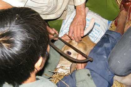 Trong lúc ấy, nhóm thanh niên vẫn đang gân sức giữ hươu. Con hươu bị đau càng quẫy mạnh. Người thợ cưa nhanh chóng lấy lá cầm máu đã được giã nhuyễn gói trong miếng lá dong được cắt tròn dịt nhanh vào vết thương, rồi dùng cọng rơm mới buộc chắc lại. Một gian chuồng bên cạnh đã để trống sẵn.
