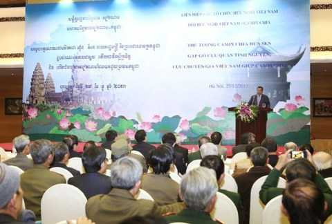 | Thủ tướng Campuchia Hun Sen trò chuyện cùng các cựu chiến binh Quân tình nguyện Việt Nam tại Campuchia (Nguồn: TTXVN) |