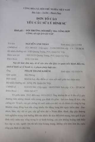 Sau vụ này, vì quá lo sợ, bà Thảo đã làm đơn tố cáo đến Phòng cảnh sát điều tra trật tự xã hội Công an TP.HCM (PC 45) và cơ quan này đã chỉ đạo Công an quận Gò Vấp xử lý.