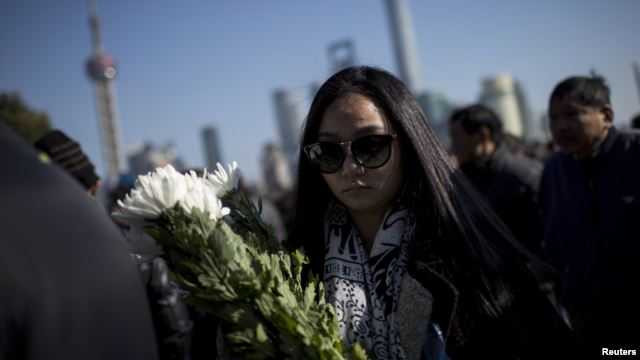 | Người phụ nữ đặt hoa trong lễ tưởng niệm các nạn nhân vụ giẫm đạp đêm 31/12 ở Thượng Hải |
