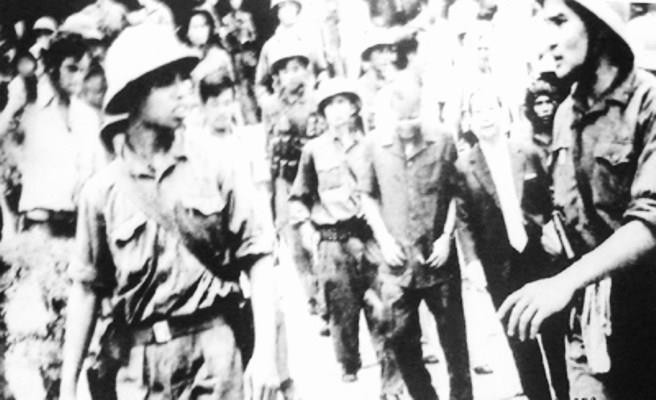Quân Giải phóng dẫn tổng thống Dương Văn Minh ra Đài phát thanh đọc tuyên bố đầu hàng. (Ảnh: Tư liệu)