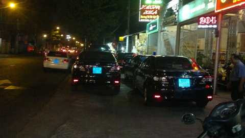 Có mặt tại đây lúc 19h30 tối cùng ngày, phóng viên VTC News nhận thấy có 6 xe công mang biển kiểm soát: 60A – 001.99, 60C – 0032, 60C – 4799, 60A – 001.17, 60C – 7868 (có sử dụng đèn ưu tiên), 60A – 001.06 đang đậu la liệt trên vỉa hè, dưới lòng đường. Các loại xe này hầu hết là chủng loại Toyota Corola Altis, Toyota Land Cruiser (7 chỗ) và Toyota Camry.