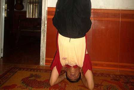 | Ông Khang với tư thế “trồng cây chuối bằng đầu” |