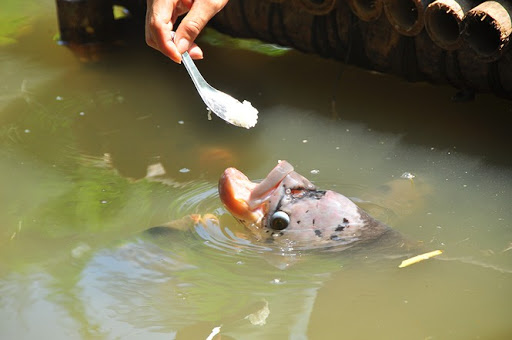 Đàn cá tai tượng gần 100 con của anh Nguyễn Ngọc Chiến ở Bình Thủy (Cần Thơ) được nuôi bằng cơm trắng, mỗi bữa anh đều dùng muỗng đút cho từng con ăn.