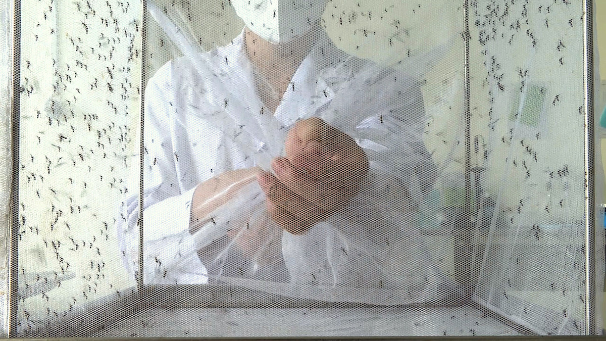 Ở phòng bên cạnh, anh Quang rửa sạch tay bằng xà phòng và lau khô. Tiến đến lồng vải chứa hàng trăm con muỗi, anh nhẹ nhàng mở lồng, hít một hơi thật sâu rồi cho tay vào, tay còn lại túm chặt mép vải, không để muỗi bay ra ngoài. Đàn muỗi đói đậu trên thành lồng thấy "thức ăn" liền bâu lại hút máu.