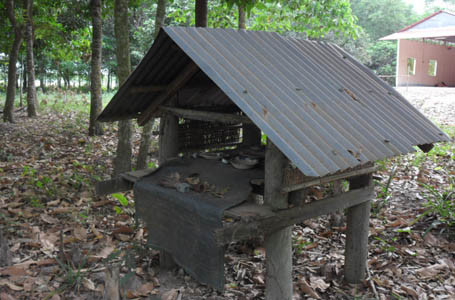 Khi tôi có ý định thắp nhang cho những người quá cố ở khu vườn mộ lạ kỳ này thì nhà sư Quo Xa Toa ngăn lại. Theo vị tu hành này thì những khách thập phương, những người vô tình ghé qua, không có người thân nằm ở khu vườn mộ này thì chỉ được thắp hương ở khu miếu Ông Tà. Đó là một cái miếu nhỏ, xây kiên cố và luôn luôn xuất hiện ở tất cả các khu vườn mộ.