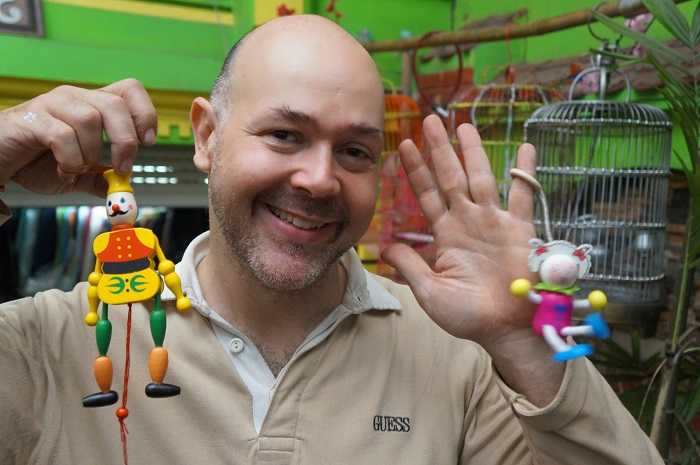 Vào giờ tan tầm buổi chiều trước các cổng trường tiểu học, thi thoảng người ta vẫn thấy một "ông Tây" đi một chiếc xe Dream cũ cùng một chiếc giá treo búp bê gỗ đằng sau mời chào các em học sinh mua hàng.