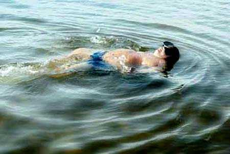 | Ông Út Hà tự làm nổi trên mặt nước. Ảnh: Minh Tiến. |