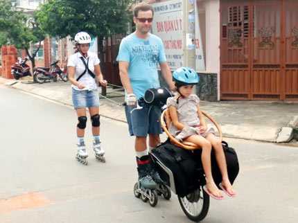 Chiếc xe lạ này trông gần giống xe rùa của thợ hồ, được giới chơi xe cho là xe “độc”. “Độc” bởi xe chỉ có một bánh, còn các bộ phận khác như kèn hơi, đồng hồ kilomet, đèn, thậm chí chiếc túi đựng đồ đi du lịch được gắn sau xe. Chưa hết, người điều khiển phía sau kiêm giữ thăng bằng cho xe phải đi giày trượt patin.