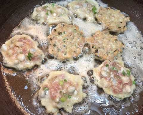 | Bắc chảo lên bếp, thêm dầu ăn vào chảo. Khi dầu ăn nóng già, dùng thìa xúc từng thìa hến cho vào chiên chín vàng 2 mặt. |