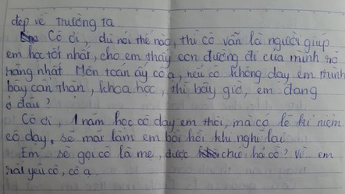 Cô ơi, một năm học cô thôi mà có lẽ những gì cô dạy, những kỷ niệm với cô sẽ mãi làm em bồi hồi khi nhớ lại. Em sẽ gọi cô là mẹ, được không ạ vì em rất yêu cô.