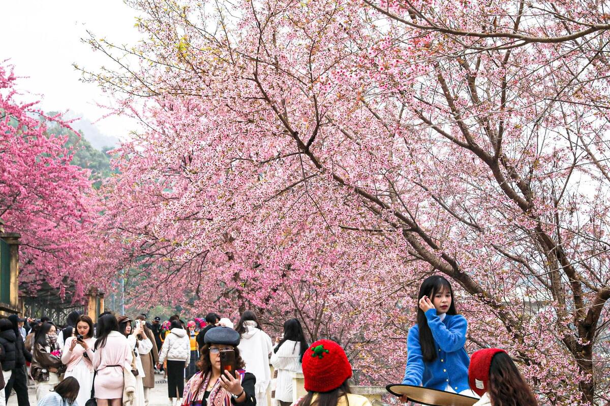 Hoa mai anh đào bung nở khắp lối vào, từ cổng đồn cho đến những hàng cây hai bên đường, khiến bất cứ ai đặt chân đến đều phải dừng lại để chiêm ngưỡng và lưu lại khoảnh khắc rực rỡ giữa cao nguyên đá.